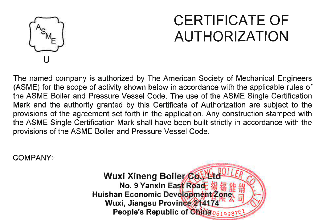 Founded in 1997, Wuxi Xi'neng Boiler Co., Ltd (P.R. China) is a professional manufacturing company for boiler and pressure vessel. Our company covers an area of more than 100,000 square meters, with more than 500 workers and more than 150 engineering technicians of various types. Our company holds "S" and "U" stamps of ASME (American Society of Mechanical Engineers) standards, Class-A Boiler Manufacturing License, D1D2 Pressure Vessel Manufacturing License of China.